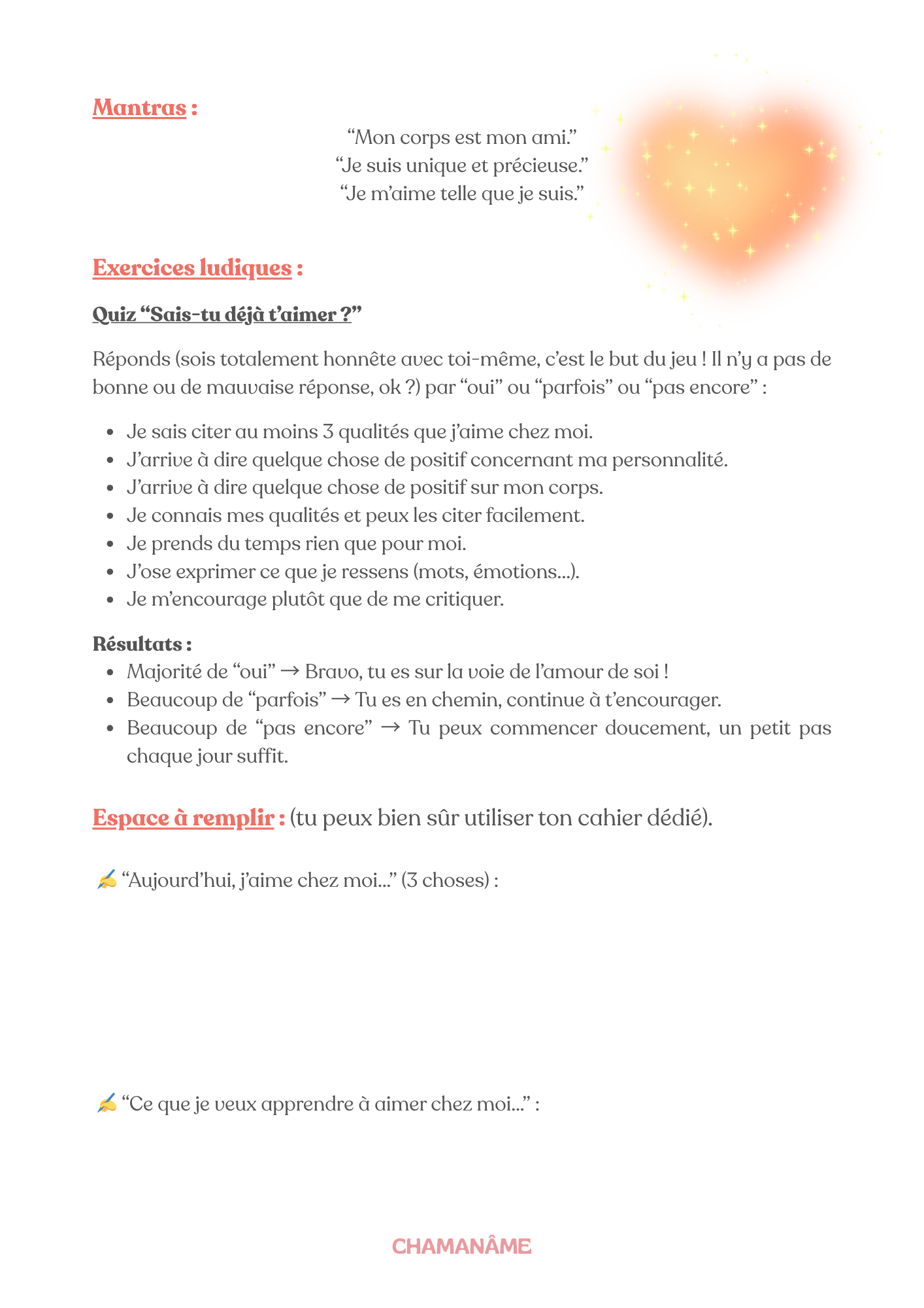 - et surtout, de puissants mantras positifs pour t’aider à cultiver l’amour de toi, le calme intérieur et la motivation au quotidien.